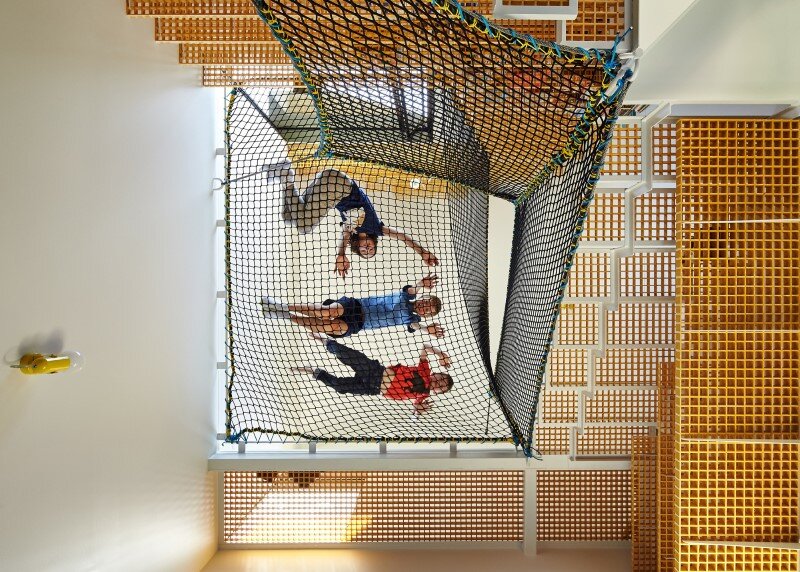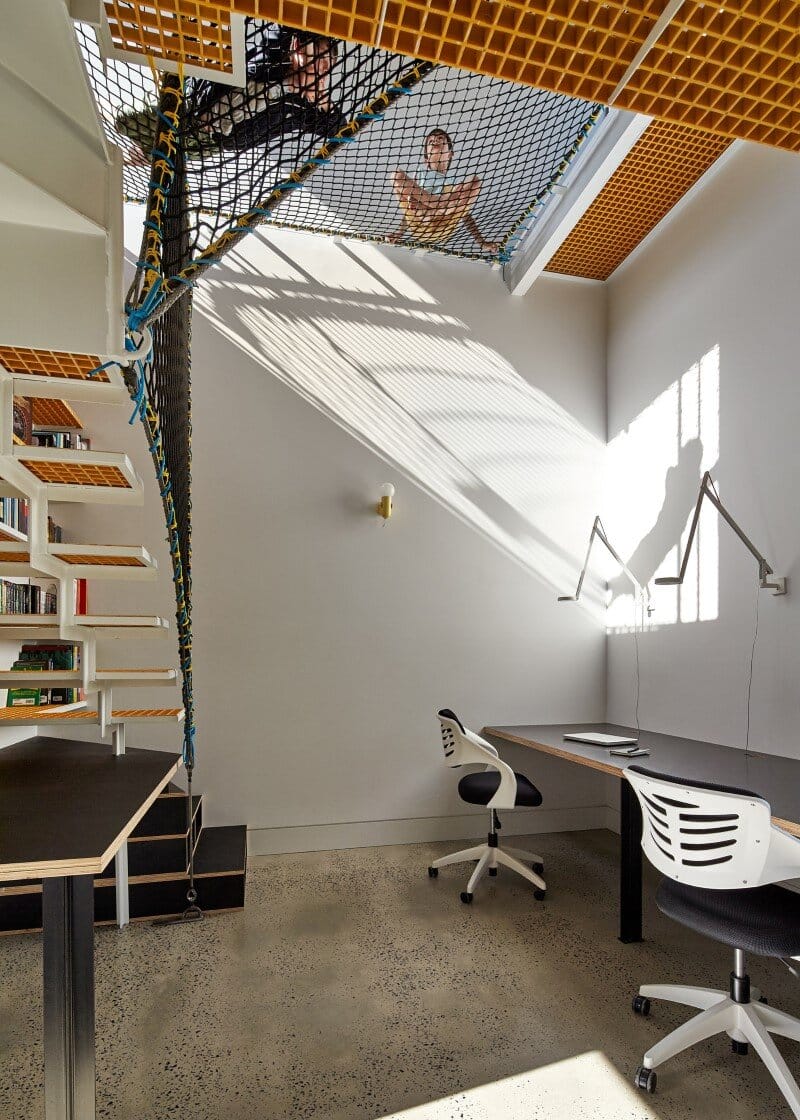Australia is wide and flat. As a result our homes are wide and flat. Our HOUSE House project explored the idea of creating a vertical home, in contrast to the typical Australian home. The boys studio pushes this idea further. It is a wholly vertical space with a bookshelf running from floor to ceiling. The boys desks are at the base of the studio, where they can studiously work. Hanging within this tall space is a net where the boys can read, and contemplate with a view to the street and a view to the backyard. The boys study is designed to inspire the boys as they grow and learn.