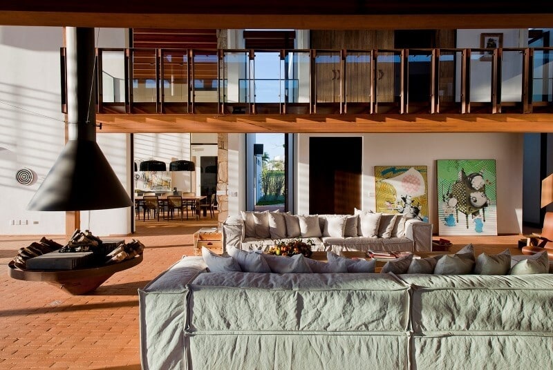 The internal circulation is solved via a walkway ring that connects the suites, while revealing the living room and the people moving around and meeting each other. In order to enjoy from the astonishing views, the main façade needed to be orientated to the North-West: this would result in the house receiving big amounts of tropical heat. Confronted with this dilemma, the solution was to propose a lattice wooden panel that elegantly hangs from the edge of the roof and acts as a brise that filters the heat and sunlight while projecting shadows over floor and walls in the form of a beautiful graphic design.