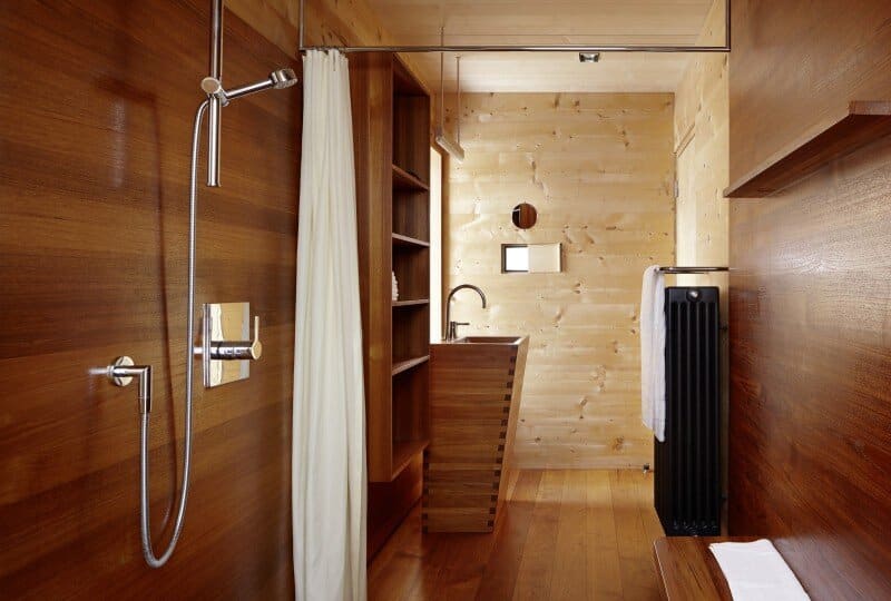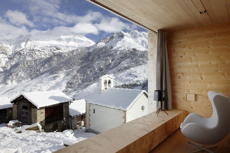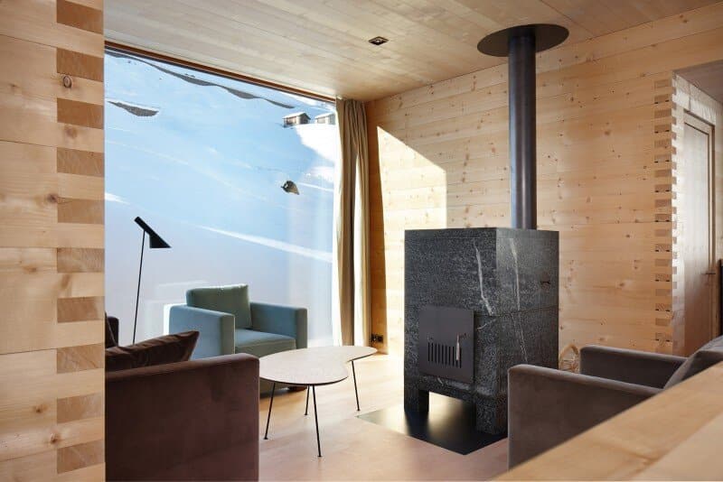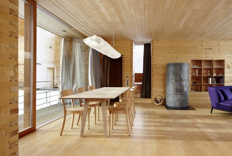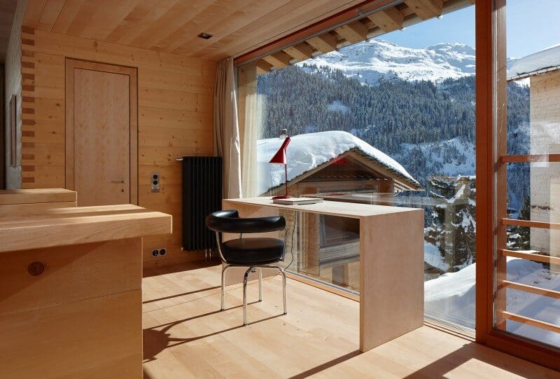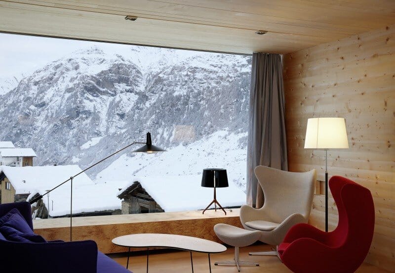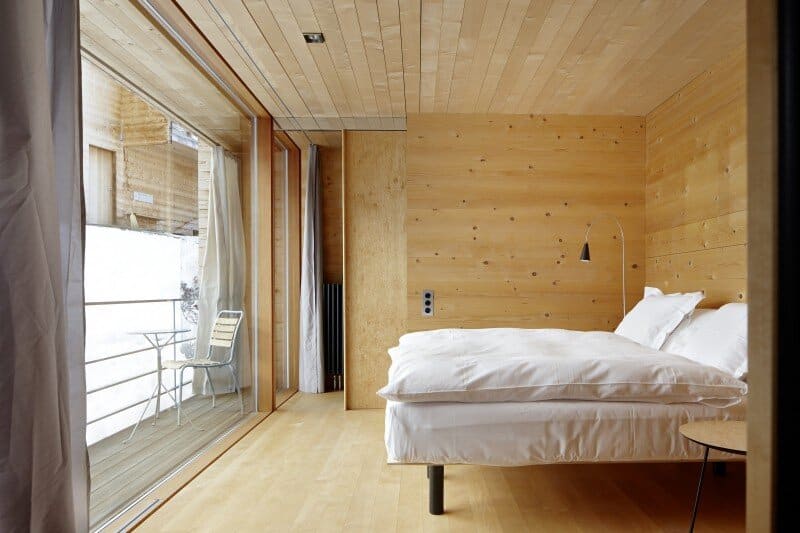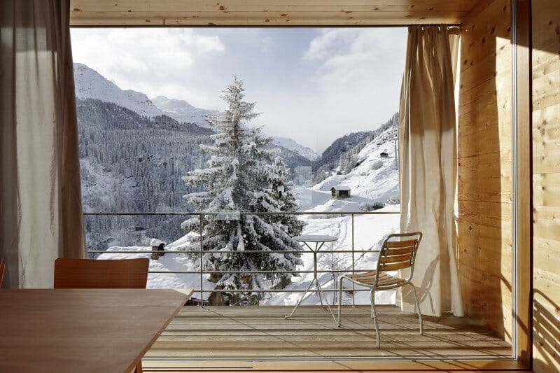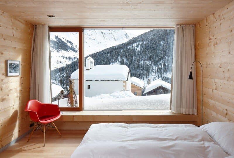 The „Leiserhäuser“ are built of solid wood and therefore have an intimate, homely appearance and a warm, pleasant indoor climate. By using new design principles Peter Zumthor has managed to incorporate large picture windows in the building that is constructed in the traditional log style. The floor-to-ceiling windows extend from wall to wall and frame the landscape.