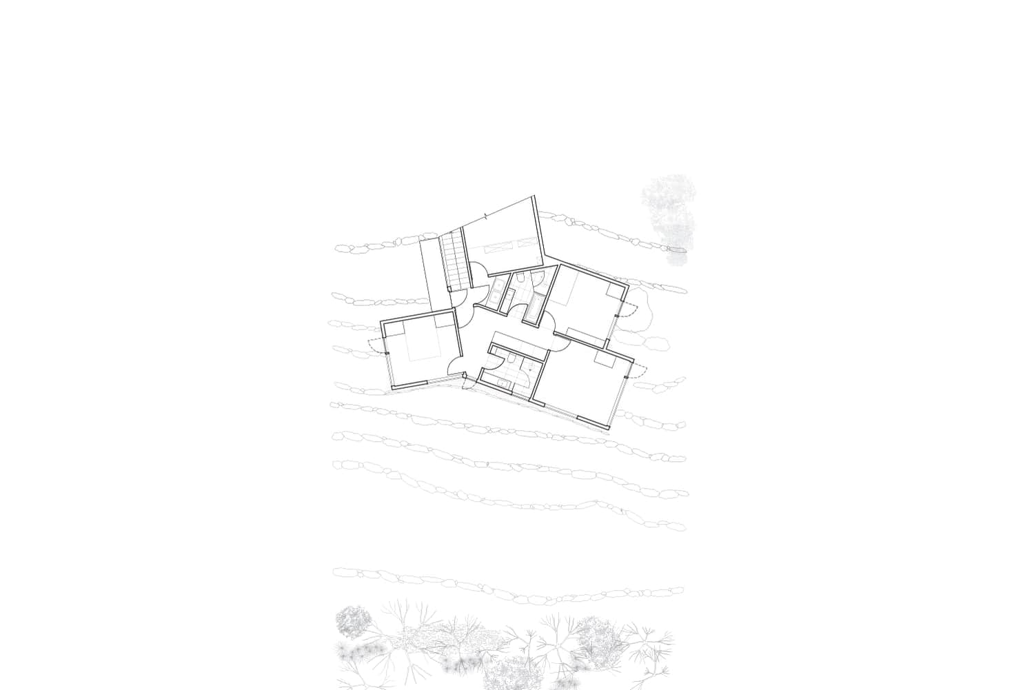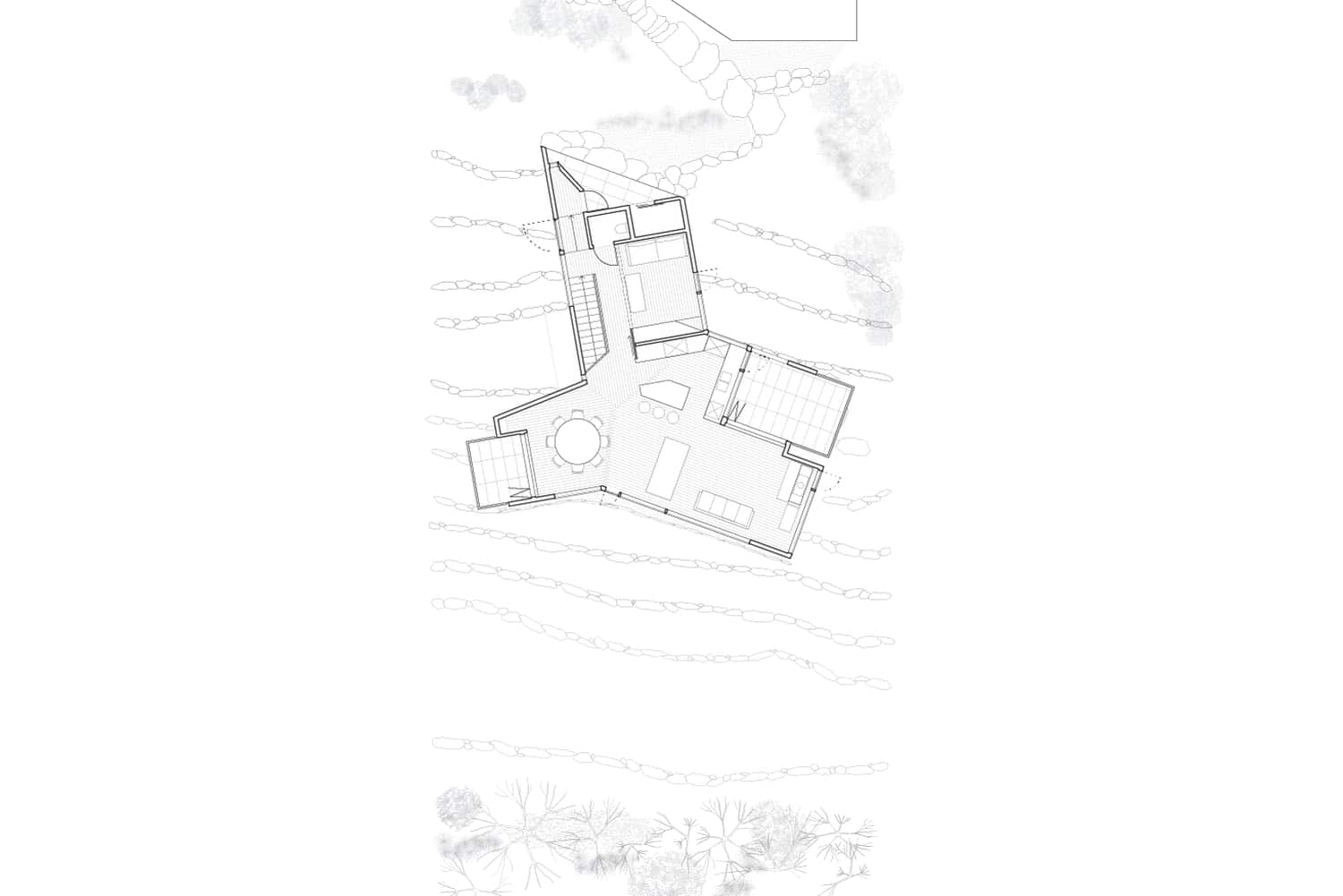 The residence is conceptualized around a Y-shaped floor plan, which not only mirrors the natural contours of the sloping terrain but also facilitates a unique separation of living spaces for three generations of a family. This spatial arrangement allows for interconnected yet private living areas tailored to the different social and recreational needs of each age group. The architectural layout ensures that each wing of the house offers distinct views and experiences of the surrounding landscapes— from the local beaches to the hilltops.